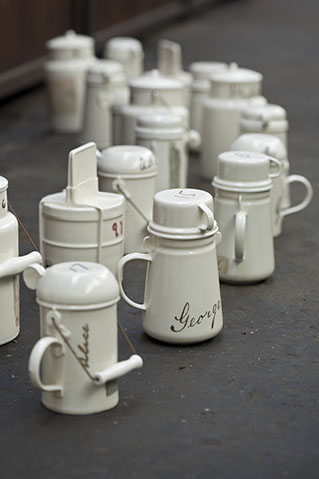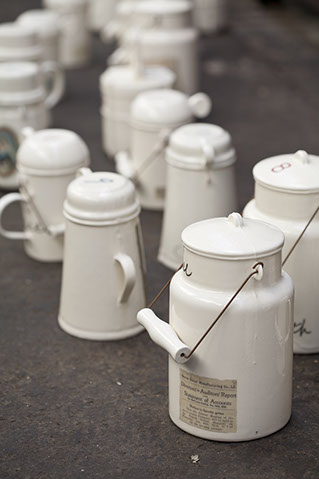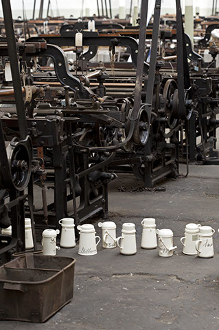 'Clocking On' makes connections with the lives and experiences of individual workers through a focus on artefacts of common and daily use. An installation of 100 billy-cans (in which the Lancashire workers brewed their tea) weaves its way from the public area of Queen St. Mill museum into the loom shed, recreating the circular format of the original workers’ clocking-on machine. The circle includes a number of tiffin boxes (in which the Indian workers took their meals to the mills).