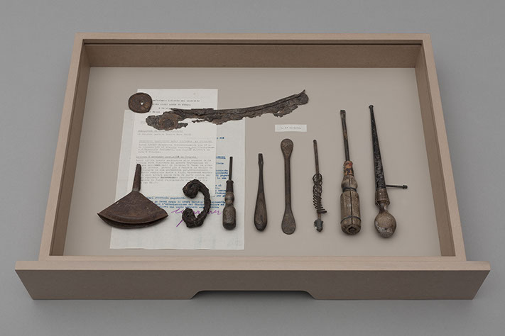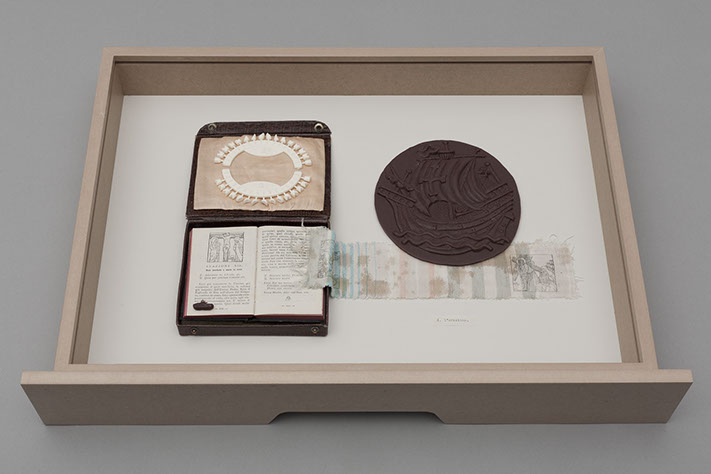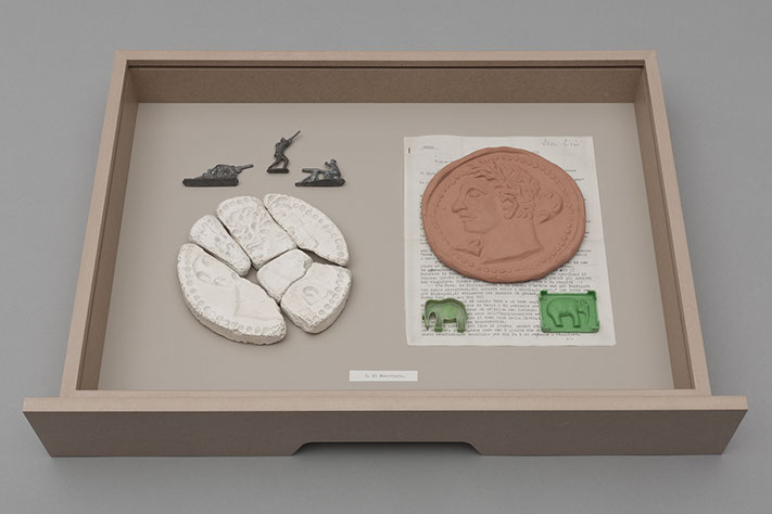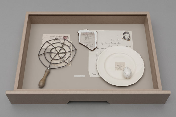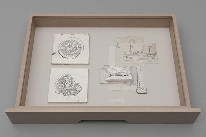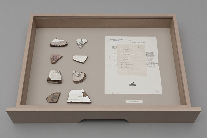 The work took the form of an archival cabinet with arrangements of found and fabricated objects arranged in 12 glass-topped drawers, appropriating the authority of museological taxonomies and systems of display. The project employed archival research in the Crafts Study Centre, Farnham, as well as material testing of digital transfer printing systems and their application to a range of ceramic fragments and surfaces.