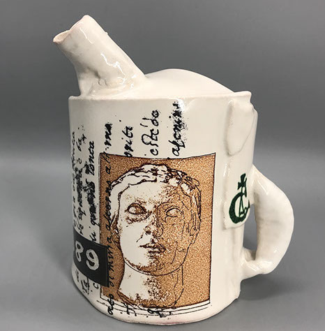 Dixon regularly uses ceramic tiles, plates and small vessels to develop narratives and test new ideas and combinations of images. This body of work combined screen-printed and laser-printed ceramic transfers, acknowledging the invention of ceramic transfer printing on Merseyside (Sadler and Green 1756-7) and developed a limited palette of copper-green and iron-brown transfers, inspired by early Italian Maiolica wares.