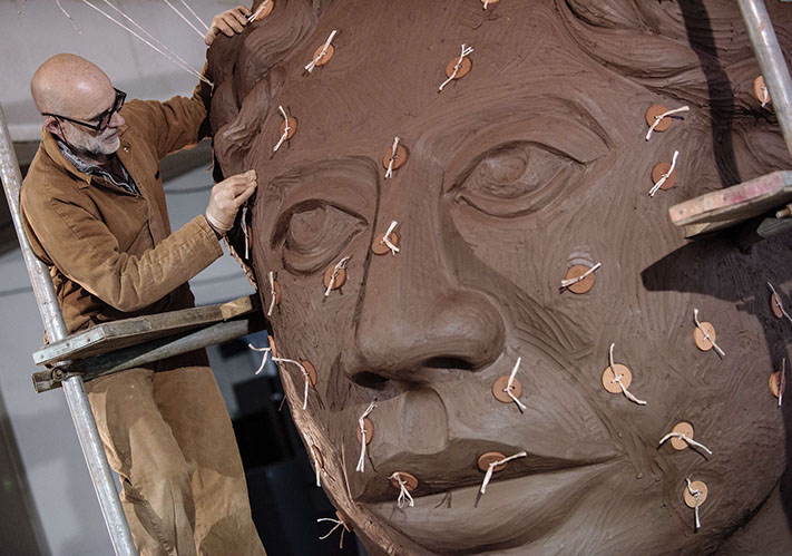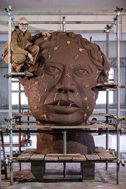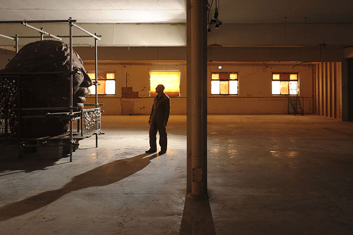The monumental clay head was constructed using two tons of Staffordshire Etruria Marl clay, and was loosely based on the head of the winged victory (Nike) figure from the Inter-Allied Victory Medal of 1919, designed by William McMillan R.A., and issued to all who served in the armed forces. However, the classical form and celebratory sentiment of McMillan’s victory medal was challenged by the industrial aesthetic of this sculpture’s supporting structure, which in contrast alludes to the functionalism and brutal materiality of trench warfare. The sculpture was allowed to air-dry naturally during the course of the Biennial, and by the end of the exhibition had begun to tear itself apart due to massive shrinkage around the scaffolding armature.