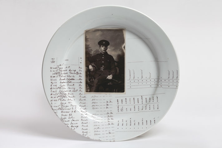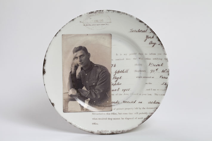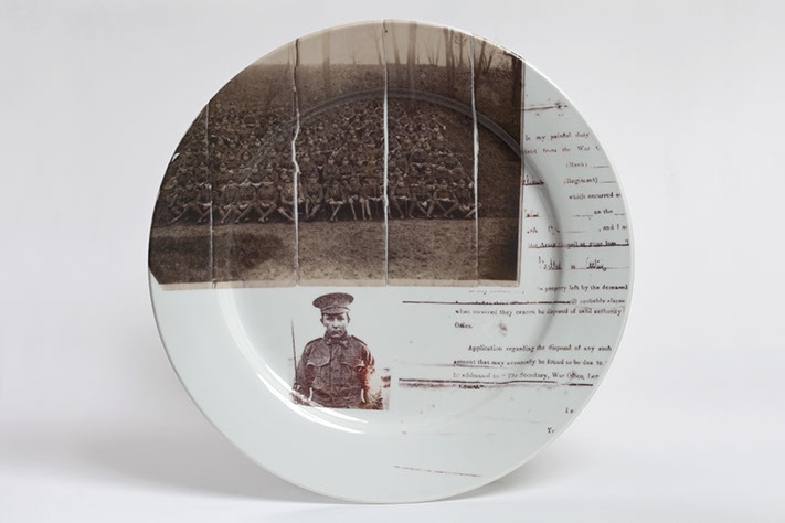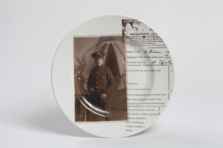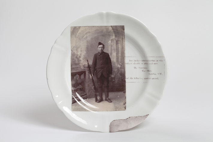 In the first phase, a collaborative work, 'At Heart a Man' was made by Dixon and the young volunteers from Staffordshire, who worked with a mixture of open source and archive materials at Manchester School of Art, to produce a printed ceramic installation depicting some of the tragic stories of underage soldiers in the Great War.